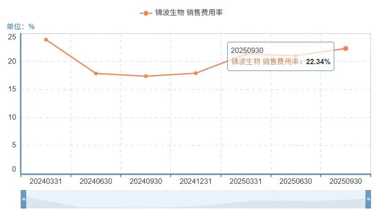 横向对比来看,同样深耕重组胶原蛋白赛道的锦波生物,近期的销售费用率则一直在22%左右。