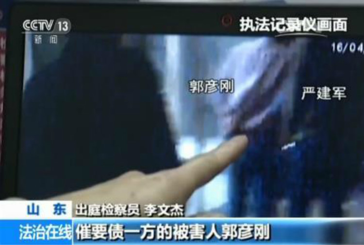 出庭检察员 李文杰:这是警车驶入源大工贸公司厂区内,警车上面一共有三位,其中女性是正式的民警,带领着两位男性的辅警。这两位辅警下午曾经来过,这个时候听到一位女士在问对方为什么摔我手机?这个时候这个画面上显示有两位男子,穿粉色衣服这是催要债被害人一方的郭彦刚,旁边那个穿绿色外套的是被害人严建军。