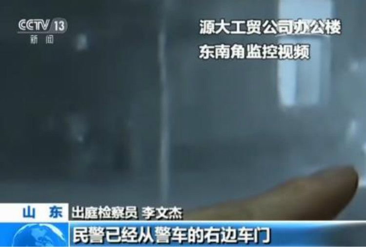 出庭检察员 李文杰:源大工贸公司办公楼东南角一个监控视频拍到了警车,画面的左下角有一个女子,这名女子就是于秀荣。可以看到于秀荣这时候已经往警车方向走了,于秀荣走到警车的左侧方,而她刚走到警车旁边,民警已经从警车的右边车门先下车。所以这个时候是不存在于秀荣说的她看着警车要走,拦在警车前面不让走,因为于秀荣刚到了警车的附近,两名警察就已经从右边车门下来了。