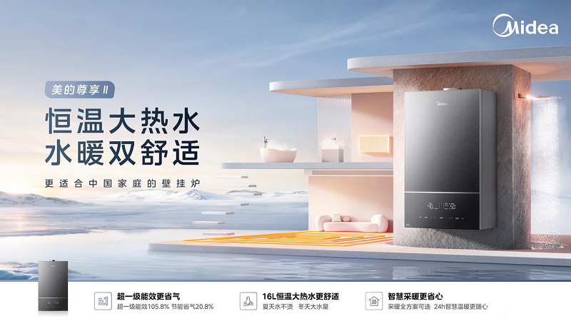 暖通行业的老玩家兼优等生,美的,在展会上发布了新品尊享Ⅱ壁挂炉。