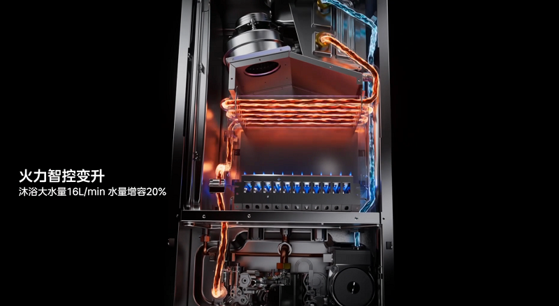其次,很多壁挂炉的问题不是没有热水,而是在关键场景下不够用。无论是浴缸放水、厨房和卫浴同时用水,还是双卫连续洗澡,尊享Ⅱ都试图用24kW做到16L/min大水量,并通过火力智控变升技术实现20%的水量提升,去覆盖更复杂的家庭用水场景。