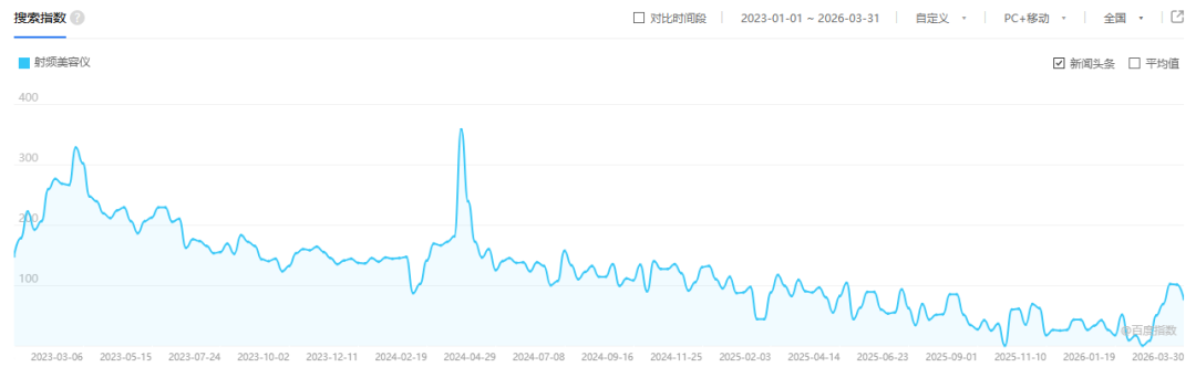 市场端的变化也印证了从业者的顾虑。据了解,曾经热销的射频类美容仪市场规模正在缩减,微电流美容仪、LED光疗面罩、大排灯等非射频类产品成为市场主流。百度指数显示,2023年以来,“射频美容仪”关键词搜索关注度持续下滑,2025年后更是出现断崖式下跌。