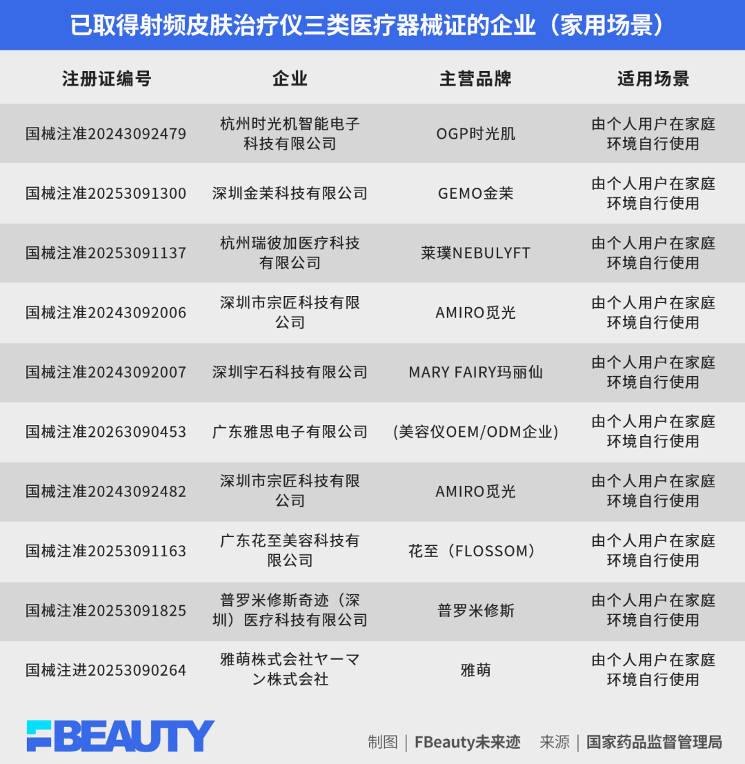 《FBeauty未来迹》在国家药品监督管理局发现,目前取得射频皮肤治疗仪三类医疗器械证的企业共有12家(AMIRO觅光母公司拿下两证),其中有3家的使用场景为医疗机构,其余均为“由个人用户在家庭环境自行使用”。