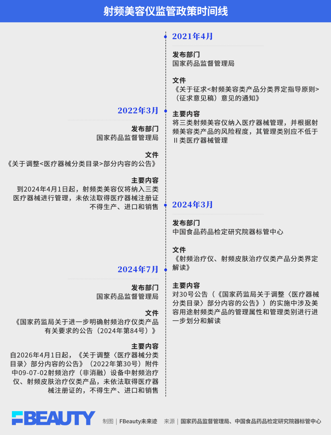 早在2022年3月,国家药品监督管理局就曾发布公告,将部分射频美容仪纳入三类医疗器械管理,2024年4月1日实施。后考虑到企业注册难度和产业有序发展问题,最终将“新规”落地时间延期到2026年4月1日。