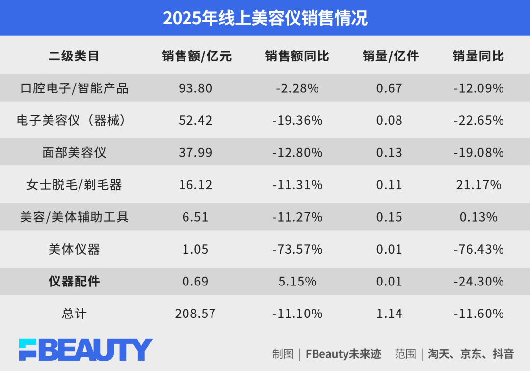 《FBeauty未来迹》整理淘天、京东、抖音三平台数据发现,在2025年全年,美容仪品类总体销售额达208.57亿元,同比下滑11.1%,销量达1.14亿件,同比下滑11.6%。其中,仅有仪器配件这一个品类实现销售额的上升,其余皆出现双位数下滑,包括电子美容仪(器械)、面部美容仪品类。