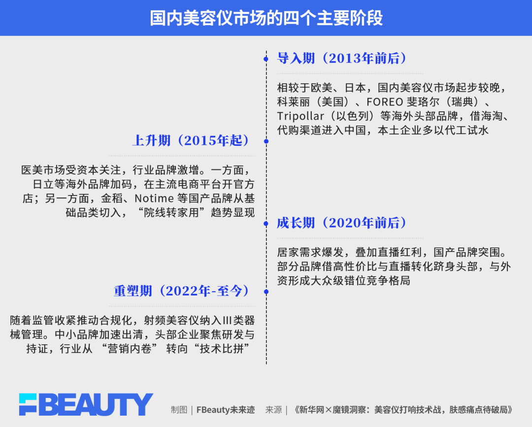 回顾国内美容仪行业历经四阶段演进,合规化是重塑格局的核心分水岭。