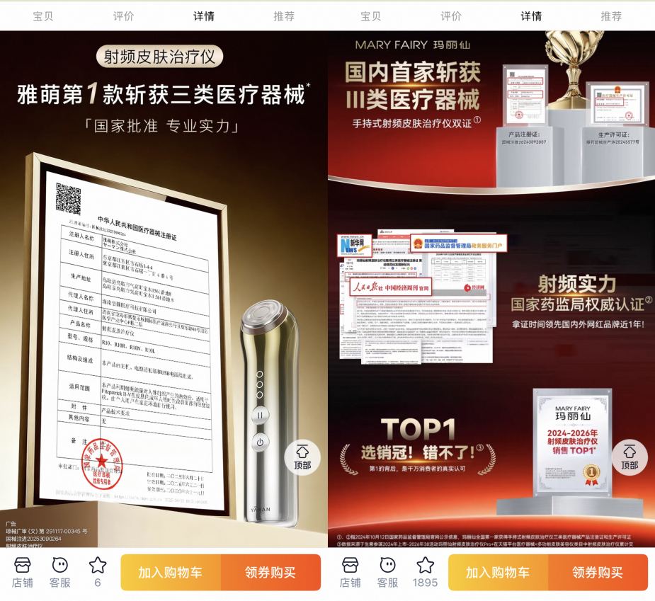 在全行业陷入信任危机的当下,合规资质正在直接转化为消费者信任与终端购买决策。目前,雅萌、MARY FAIRY玛丽仙等已持证品牌,均在电商旗舰店首页的核心位置公示了三类医疗器械注册证信息,将合规资质作为产品的核心竞争力。
