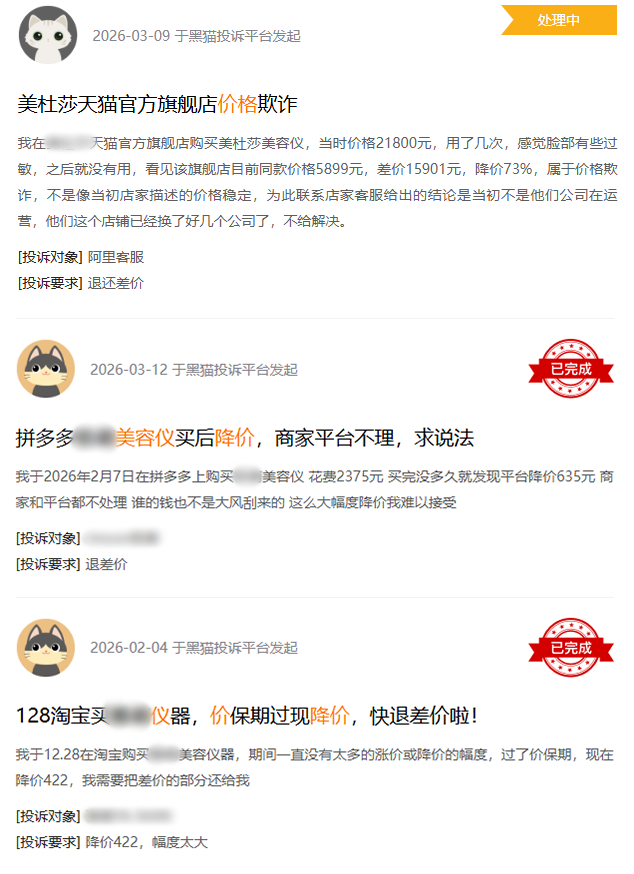 黑猫投诉平台数据显示,以“美容仪 价格”为关键词检索,相关投诉量达1284条,核心投诉点为“大幅降价、价格欺诈、拒不退差价”。