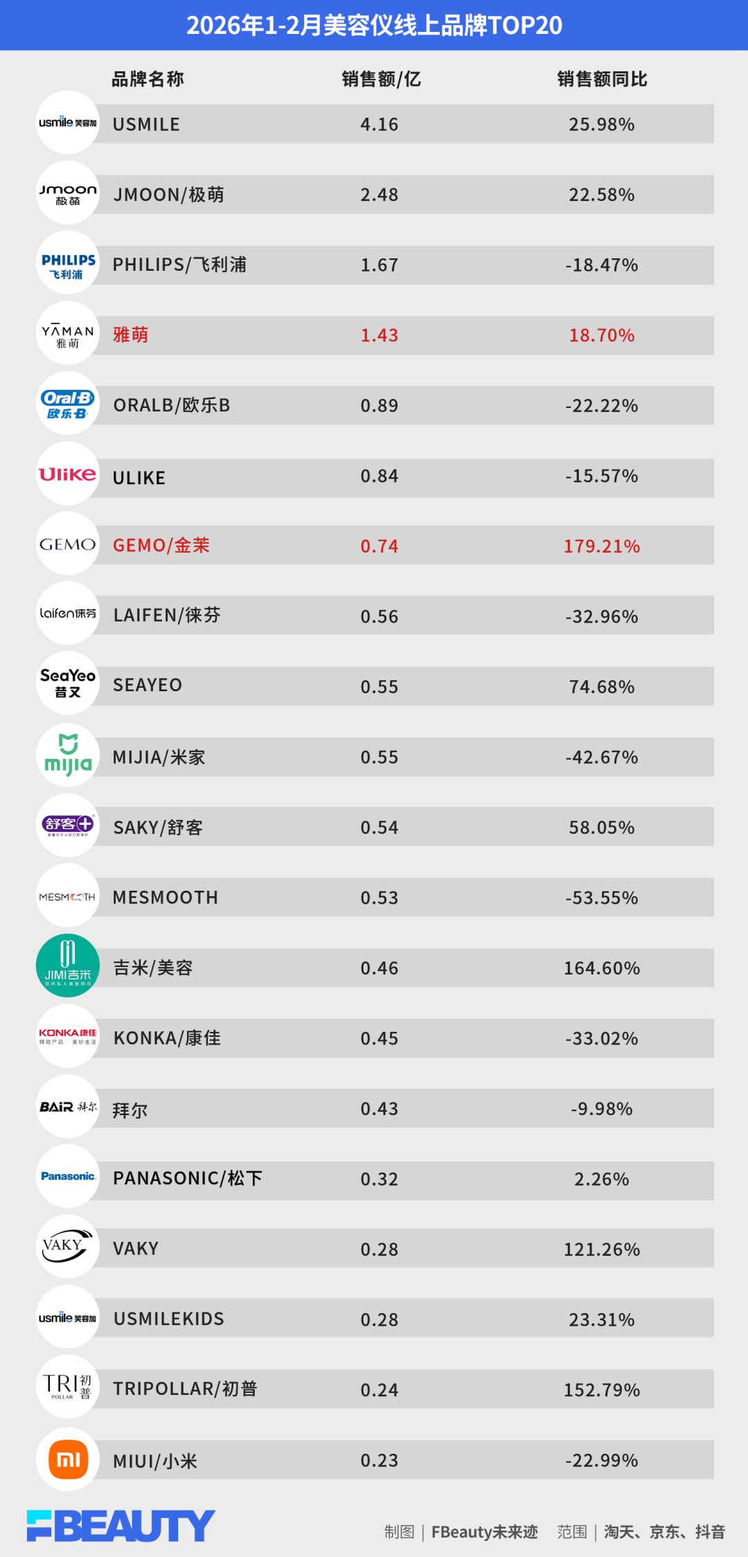 《FBeauty未来迹》整理数据发现,今年1-2月线上美容仪类目TOP20品牌中,超半数品牌实现了销售额的增长,其中包括已经拿下三类医疗器械证的雅萌和Gemo金茉。