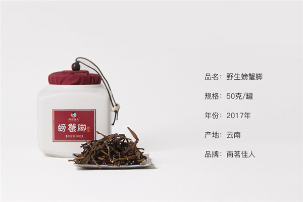 再者,由于螃蟹脚属性寒凉,与云南普洱茶生茶(晒青毛茶)的属性雷同,因此,在冲泡普洱茶的时候,也可将其少量拼配到普洱茶制品中一起冲泡品饮。这一点,需要说明的是,将螃蟹脚拼配在普洱茶制品中,是现拼配现冲泡,两者共同冲泡品饮是否有禁忌,还未得知。