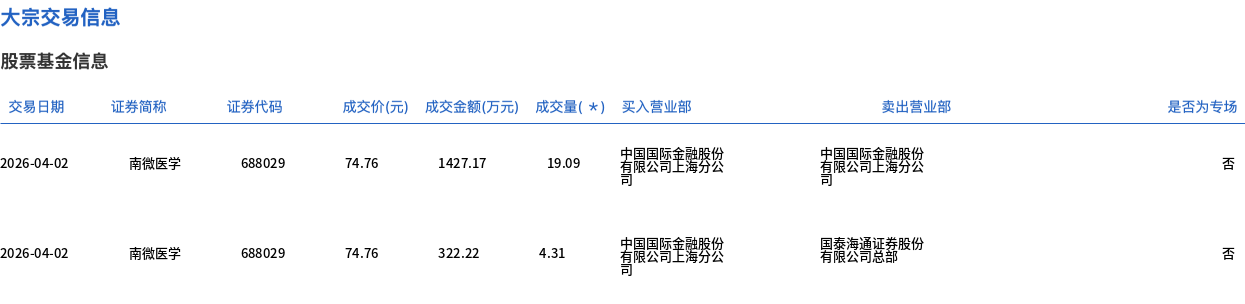 4月2日,南微医学大宗交易成交23.4万股,成交额1749.39万元,占当日总成交额的10.79%,成交价74.76元,较市场收盘价75.21元折价0.6%。
