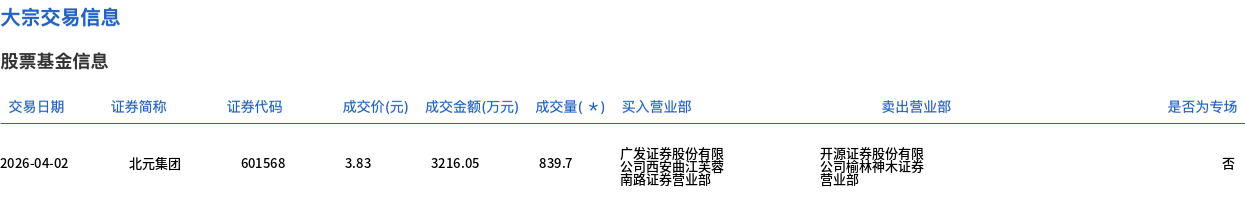 4月2日,北元集团大宗交易成交839.7万股,成交额3216.05万元,占当日总成交额的23.97%,成交价3.83元,较市场收盘价4.25元折价9.88%。