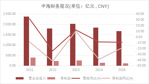 2025年,中海扣非后的归母净利润为126.91亿元,同比下降18.83%;虽然这一水平仍高于多数同行,但界面新闻整理公司近年财报发现,公司的归母净利润已连续两年下降,2024年的净利润为156.36亿元,2023年则为256.1亿元。