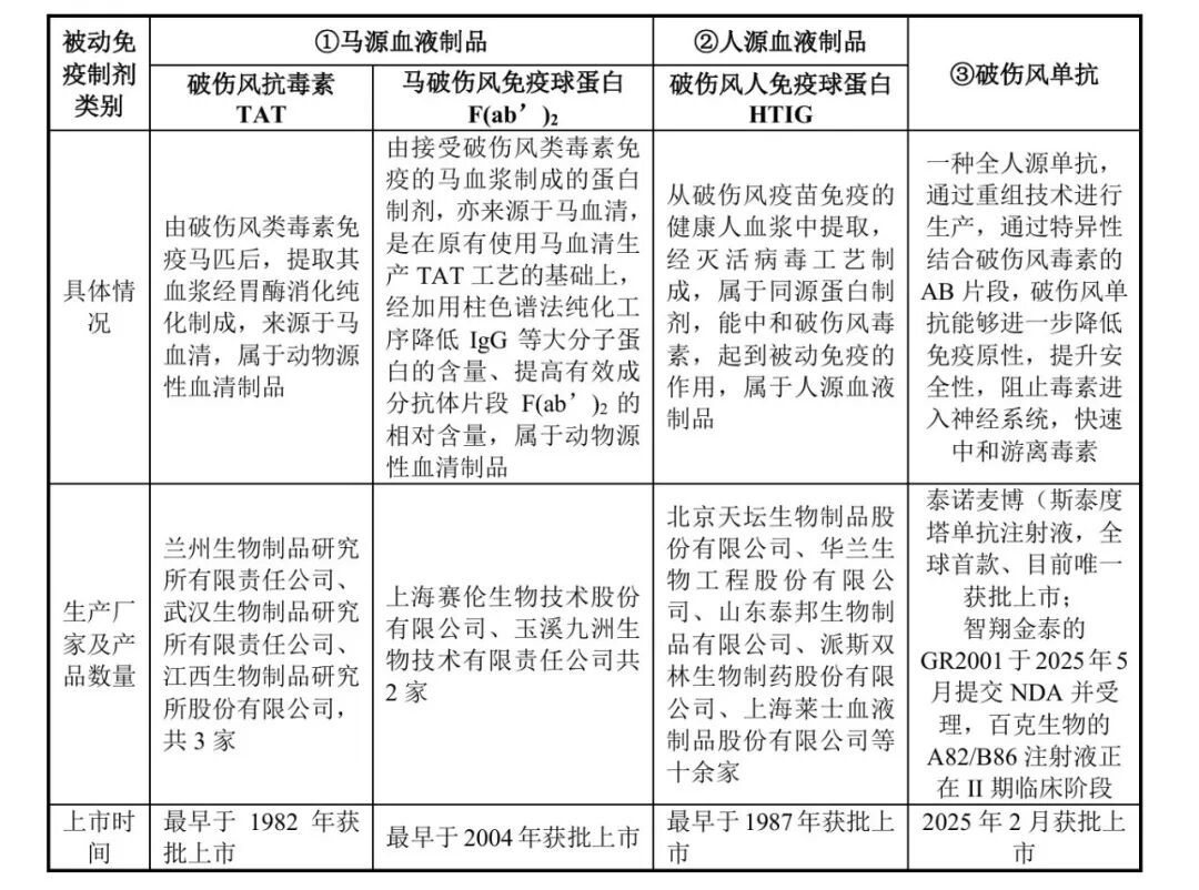 破伤风的二级预防即为被动免疫,被动免疫制剂可分为破伤风抗毒素TAT、马破伤风免疫球蛋白(这两者以下简称“马源TAT”)、破伤风人免疫球蛋白HTIG及破伤风单抗(即泰诺麦博生产的斯泰度塔单抗注射液)。