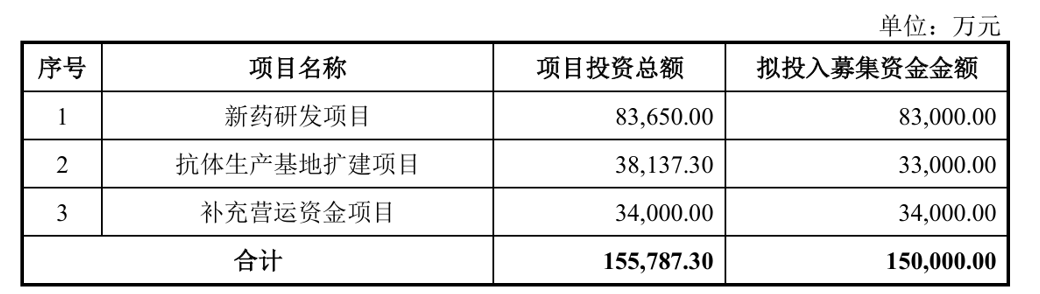 此次科创板IPO,泰诺麦博拟募集资金15亿元,其中8.3亿元、3.3亿元、3.4亿元将分别投向新药研发项目、抗体生产基地扩建项目、补充营运资金项目。本次募资将有效优化公司资金结构,显著缓解资金压力,为后续研发投入与产能扩张提供支撑。