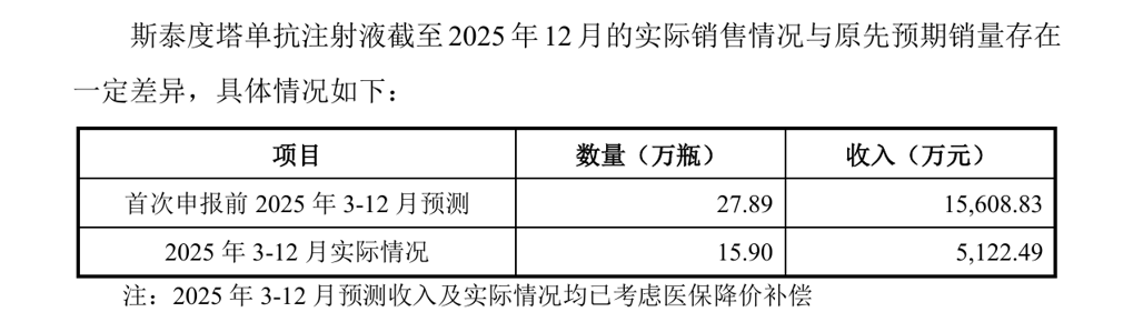 该产品于2025年3月开始销售,全年实际销量、收入均未达到预期,仅完成收入目标的33%左右;同时,其临床试验数据引发监管机构问询,成为审核重点之一。