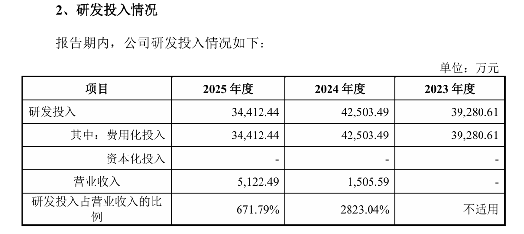 除销售费用外,公司的研发投入也居高不下。2024年、2025年,公司的研发费用分别为4.25亿元、3.44亿元,研发费用率分别为2823%、672%。