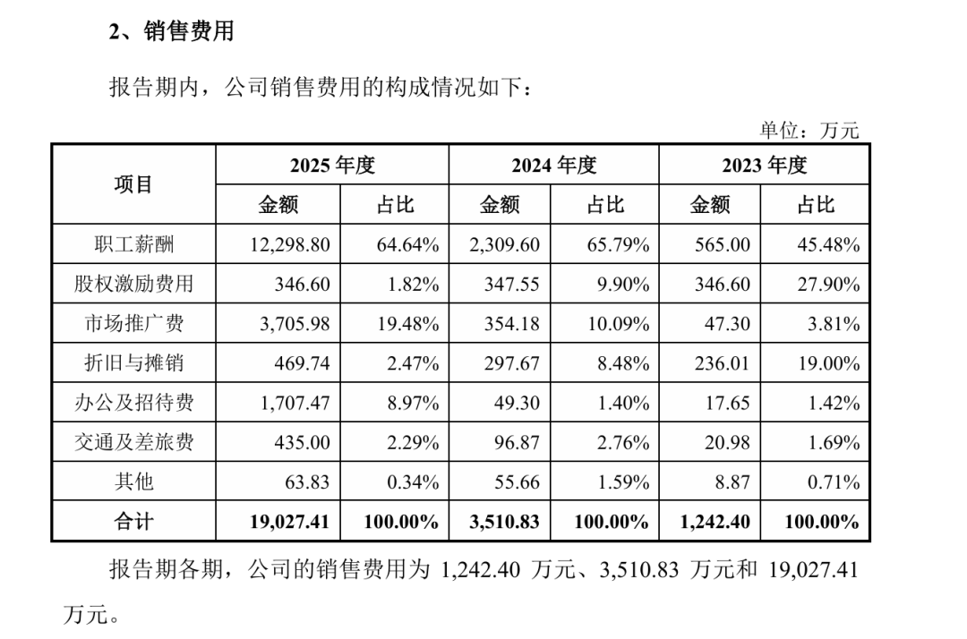 人员结构方面,截至2025年末,公司员工总数843人,其中销售人员382人,较2024年末增加210人。当年职工薪酬支出1.23亿元,同比增长433%。