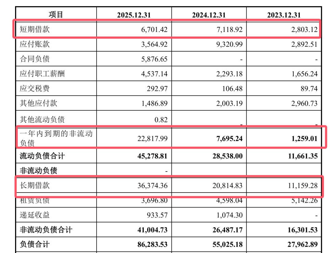截至2025年末,公司的短期借款6701万元、长期借款3.63亿元、一年内到期的非流动负债2.28亿元,合计6.6亿元,较2023年末的1.5亿元增加了5亿元。