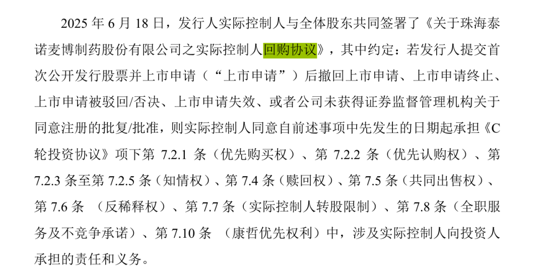 除此之外,泰诺麦博的实控人还背负着沉重的对赌压力。根据2025年6月签署的相关协议,若公司IPO撤回、终止、被驳回或否决,实控制人需回购投资人所持股份,潜在回购压力较大。