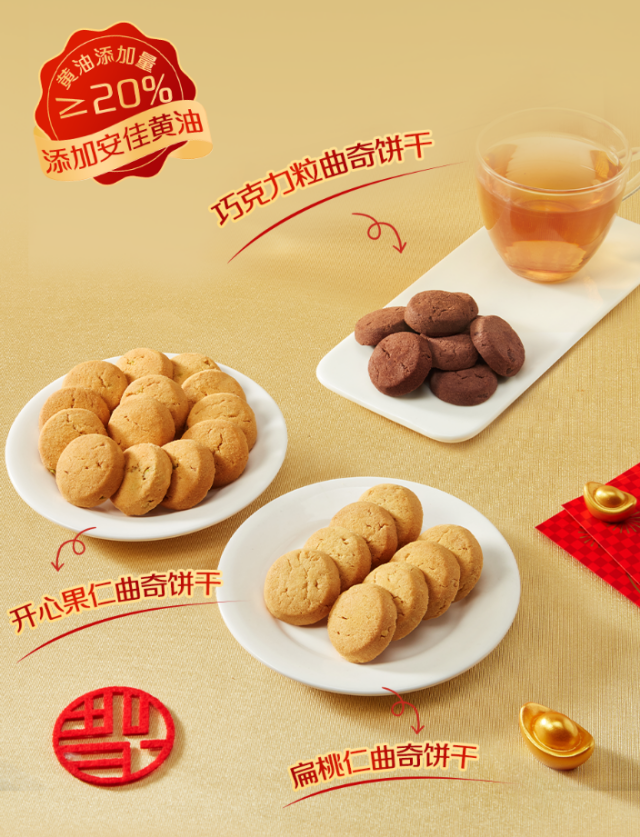 在原料工艺上,嘉顿延续百年积淀,选用新西兰进口黄油(添加量≥20%),搭配真实扁桃仁粒、巧克力粒、开心果粒等优质原料,通过传统低温烘焙工艺,最大程度保留黄油的浓郁奶香与坚果的天然香气,成就酥而不腻、口感扎实的经典品质,全流程品控体系更确保每一块曲奇的稳定与安心。