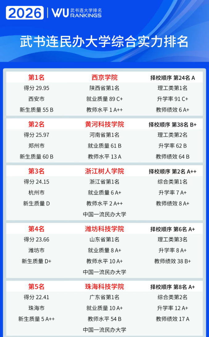 2026年3月,武书连大学排名团队完成“武书连2026中国民办大学独立学院(以下简称民办独院)排名”。西京学院列民办大学综合实力第一名,厦门大学嘉庚学院列独立学院综合实力第一名,浙大城市学院列独立学院转公办大学综合实力第一名。