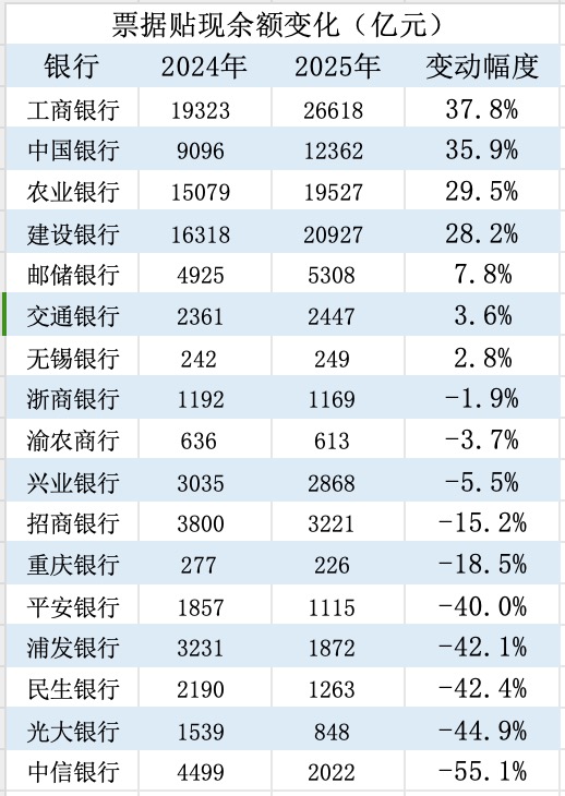 反观一些股份行,其票据压降幅度高达50%左右。例如2025年末中信银行票据贴现余额2022亿元,较上年下降55.1%。