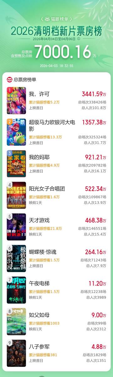 据猫眼专业版数据,截至4月3日18时32分,2026年清明档新片预售总票房破7000万,《我,许可》《超级马力欧银河大电影》《我的妈耶》暂列清明档新片预售票房榜前三位。