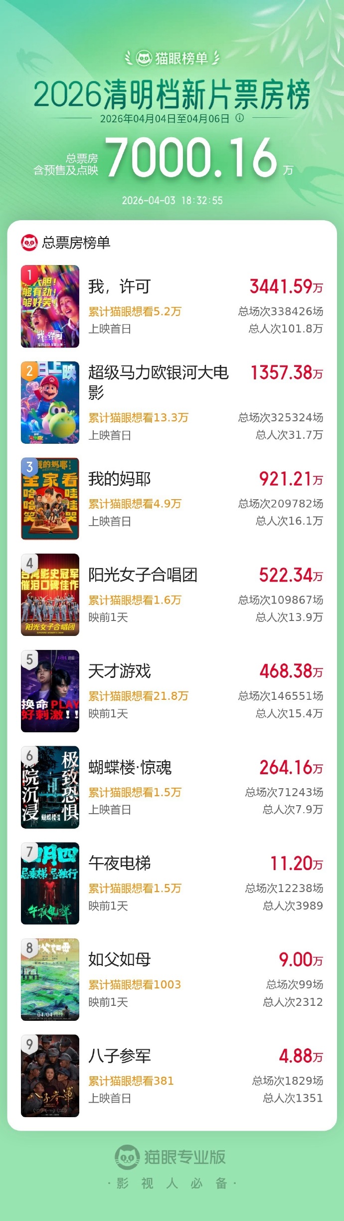 据猫眼专业版数据,截至4月3日18时32分,2026年清明档新片预售总票房破7000万,《我,许可》《超级马力欧银河大电影》《我的妈耶》暂列清明档新片预售票房榜前三位。