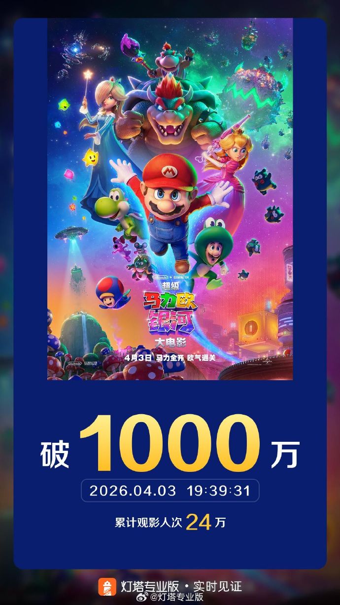 据灯塔专业版实时数据,截至4月3日19时39分,影片《超级马力欧银河大电影》票房突破1000万元。