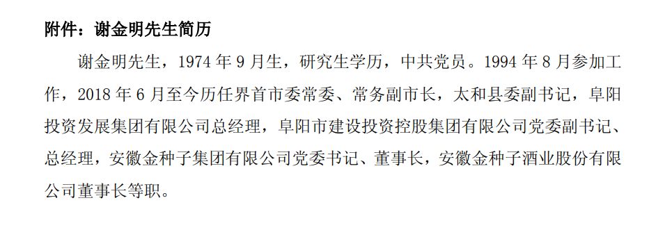 此次兼任上市公司总经理,意味着谢金明将董事长与总经理的职责“一肩挑”。公告显示,此次履新前,谢金明已辞去在阜阳投资集团、阜阳建投集团以及金种子集团的相关职务。同时,根据公司章程规定,公司法定代表人也由何秀侠变更为谢金明。
