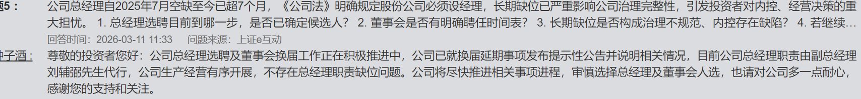 今年3月11日,公司还在互动平台上对投资者表示,公司不存在总经理职责缺位问题,总经理选聘工作“正在积极推进中”。如今,这一职位最终由公司“一把手”亲自填补。