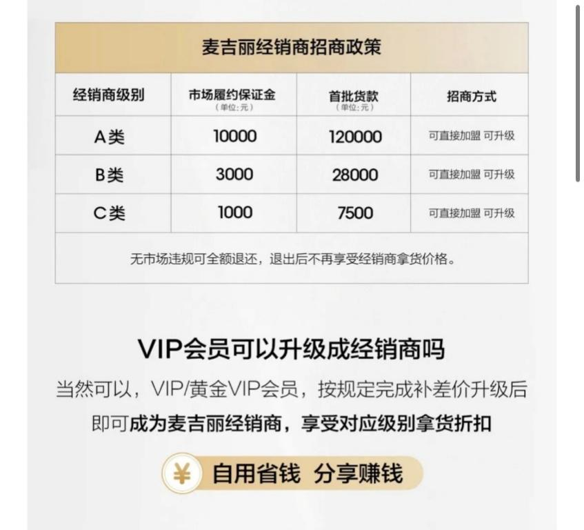 文章显示,麦吉丽现在设有三级经销商,缴纳对应金额的市场履约保证金+首批货款,即可成为麦吉丽对应级别经销商。此外,麦吉丽VIP会员,也可按规定补差价升级后,成为经销商,享受对应级别拿货折扣。