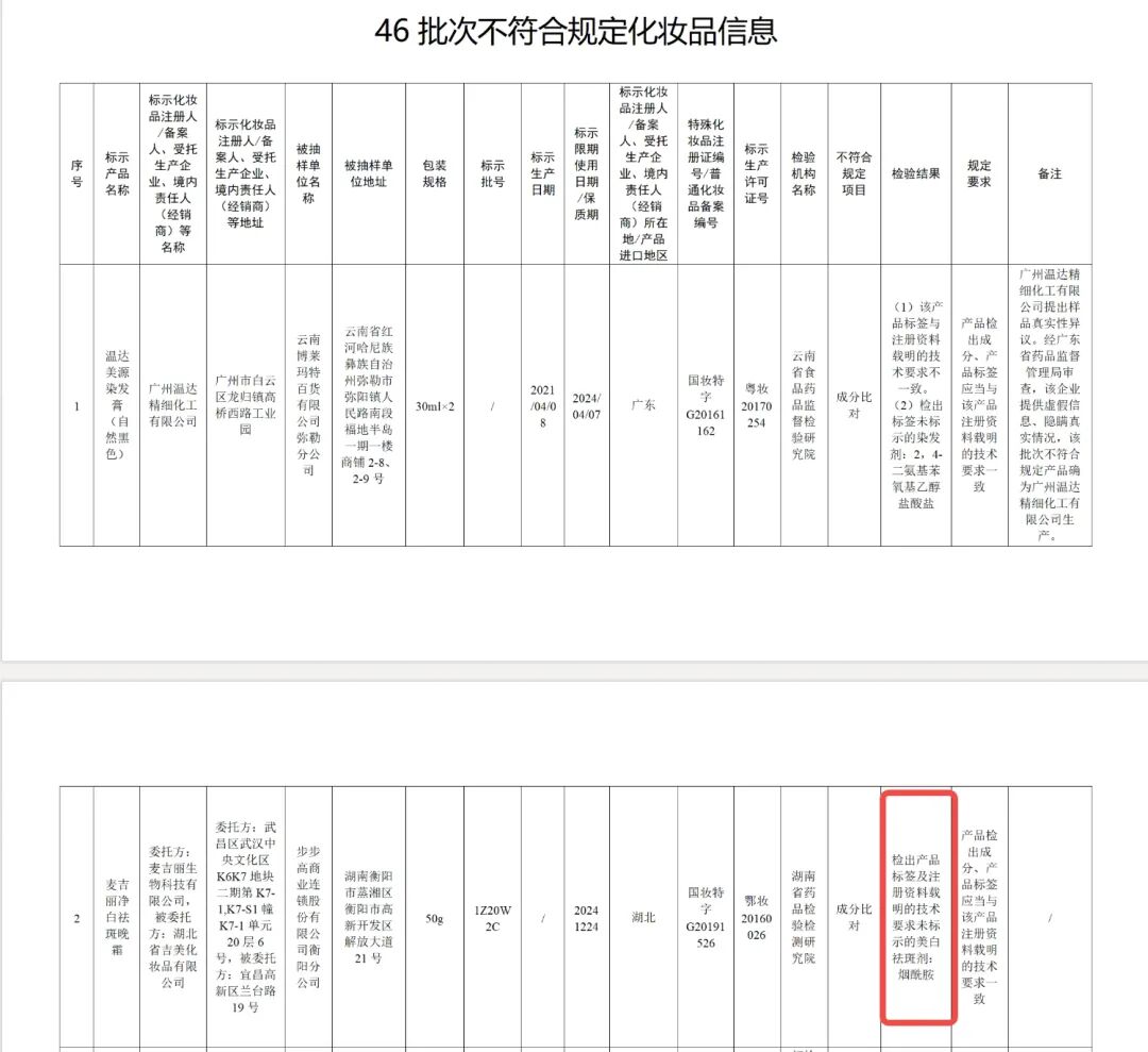 2023年,国家药品监督管理局发布了《关于46批次不符合规定化妆品的通告》,麦吉丽委托湖北省吉美化妆品有限公司生产的麦吉丽净白祛斑晚霜,被检出产品标签及注册资料载明的技术要求未标示的美白祛斑剂烟酰胺。