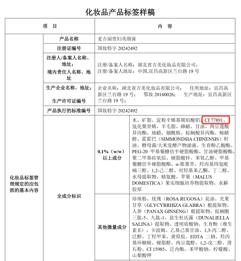 国家药监局备案信息显示,麦吉丽贵妇膏同样含有二氧化钛(CI 77891)成分,并位居成分表第四位。