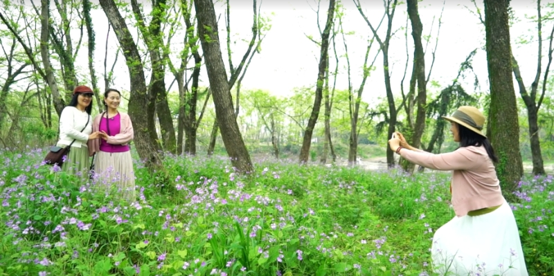 走进西溪南湿地,清澈的丰乐河蜿蜒流淌,河畔的枫杨林绿意渐浓,铺天盖地的二月兰,就像一条紫色的丝带,沿着河岸肆意铺展。微风拂过,花浪翻滚,紫色的花瓣在空中轻轻摇曳,空气中弥漫着淡淡的花香,让人沉醉不已。在这片紫色的花海里,处处洋溢着欢声笑语。来自山东的游客张振和姐妹们正随着欢快的音乐载歌载舞,她们的笑容在紫色花海的映衬下,显得格外灿烂。“我从山东来,看到这片花海特别美,我跟姐妹们情不自禁地跳起来,载歌载舞好开心。”山东游客张振说道。