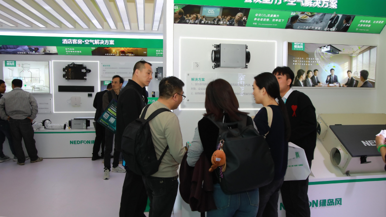 绿岛风各个场景展区吸引大量参观者驻足。吊顶式热回收新风机作为明星产品之一,可高效匹配酒店大堂、会议厅及客房等场景的通风换气与能源利用需求,在实现空气多重过滤和平衡送风的同时,提升整体能源利用效率,实现节能性与实用性的双重保障。