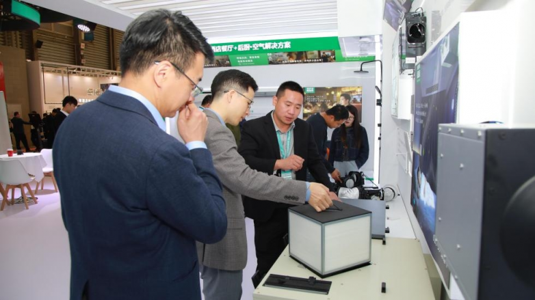 酒店餐厅多为开放式厨房,且用餐区常常与其他功能区相连,对油烟控制、气味阻隔的要求极高。在酒店餐厅场景区,绿岛风展出的高效油烟专用风柜成为了焦点。风柜采用前向多翼式双进风叶轮,并与电机直联传动,具有大风量、高静压、高效率、运行平稳的特点,同时降噪隔音,能在低噪的前提下对油烟进行强力抽排,防止酒店餐厅出现油烟串味、菜品气味交叉的情况。此外,该款风柜还增加了排油设计,能有效防止长期使用下的油污堆积。