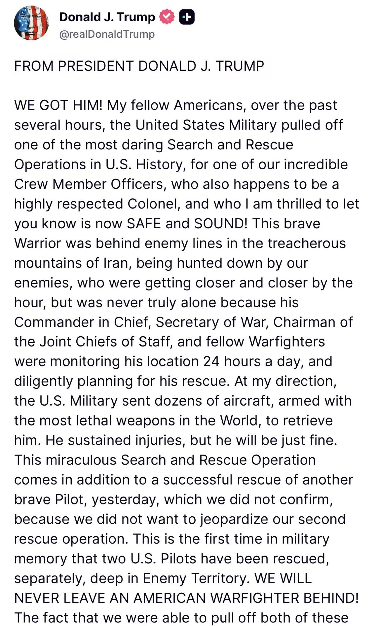 特朗普在社交媒体上说,过去几个小时,美军执行了“美国历史上最大胆的搜救行动之一”,找到了第二名飞行员。这名飞行员“已平安无事”。