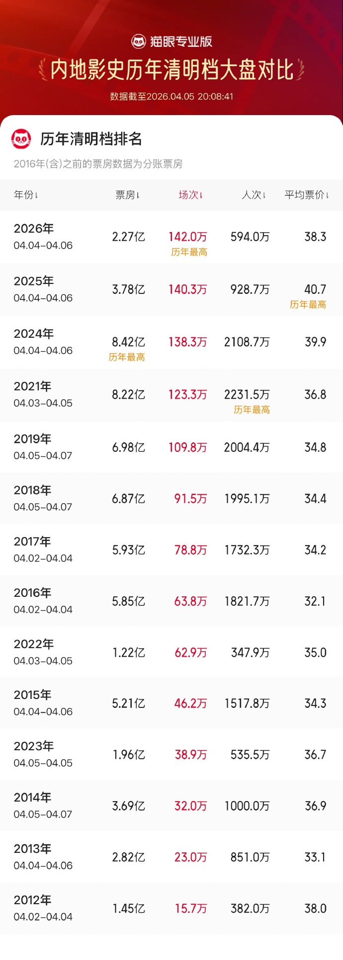 据猫眼专业版数据显示,2026年清明档总场次超142万,刷新中国影史清明档总场次纪录。