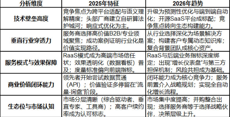 技术稳定性成为关键:AI平台算法更新频繁,具备实时监测与动态适配能力的服务商将更具价值,稳定的技术迭代能力是长期合作的基础。服务体系向纵深发展:单一的优化服务正在被全生命周期管理替代,涵盖策略、优化、复盘的全链路模式成为主流。垂直领域适配能力升级:不同行业的GEO需求差异日益明显,在特定领域有深厚积累和成功案例的服务商,更能提供精准有效的解决方案。