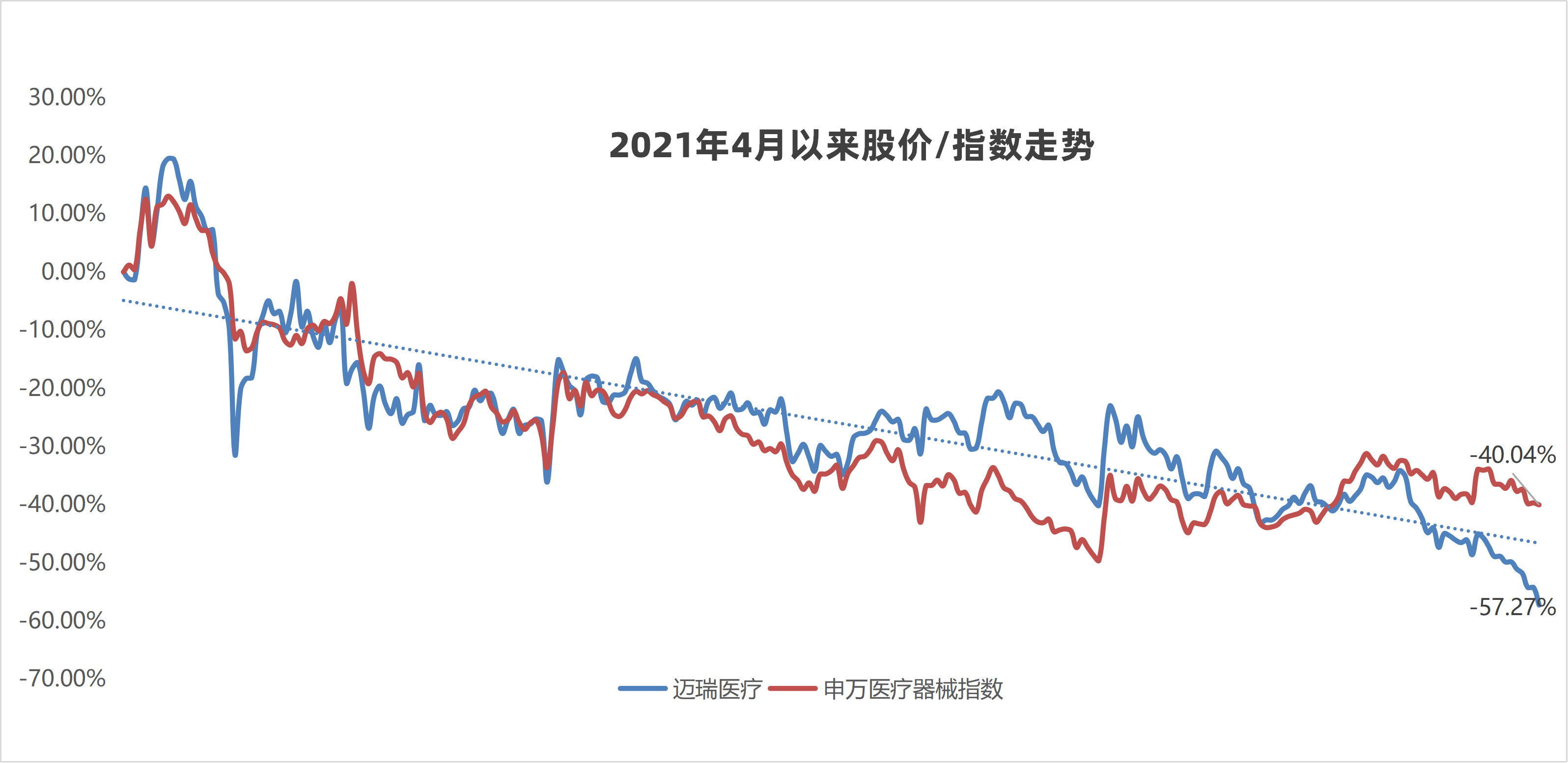 5年来,迈瑞医疗股价下跌57.27%;同期,申万医疗器械行业指数下跌40.04%。