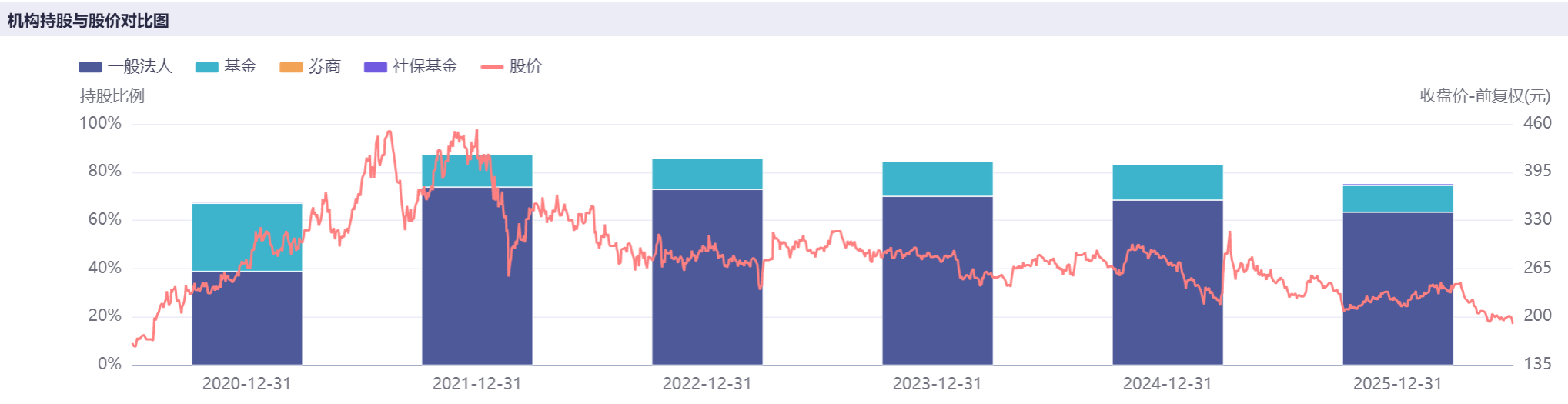 2025年底,迈瑞医疗持股的机构数量为962家,较2024年底减少164家;机构累计持股数量9.12亿股,较2024年底减少9800万股;机构持股比例为75.25%,比2024年底减少8.07个百分点,也是近5年最低水平。