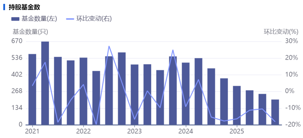 基金的动作更具代表性:数据显示,2021年一季度末有569只基金持有迈瑞医疗,持股总市值超过500亿元;到2025年底仅有204只基金持有迈瑞医疗,持股总市值为150亿元左右。