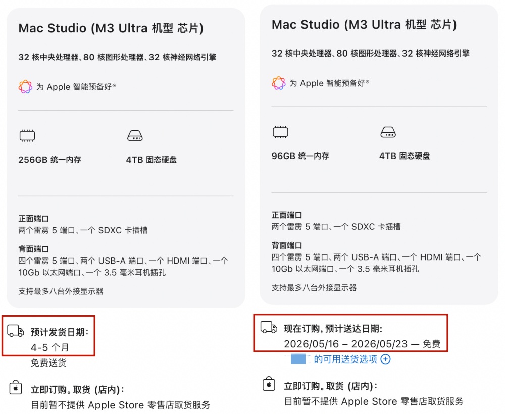 4月7日,界面新闻查询苹果中国官网发现,若选择大内存容量的Mac mini和Mac Studio机型,预计配送等待时长最长可达4-5个月。这种情况不仅出现在中国,苹果美国官网同样显示部分高配产品发货周期严重延迟,部分门店的自提服务甚至排到了9月份。
