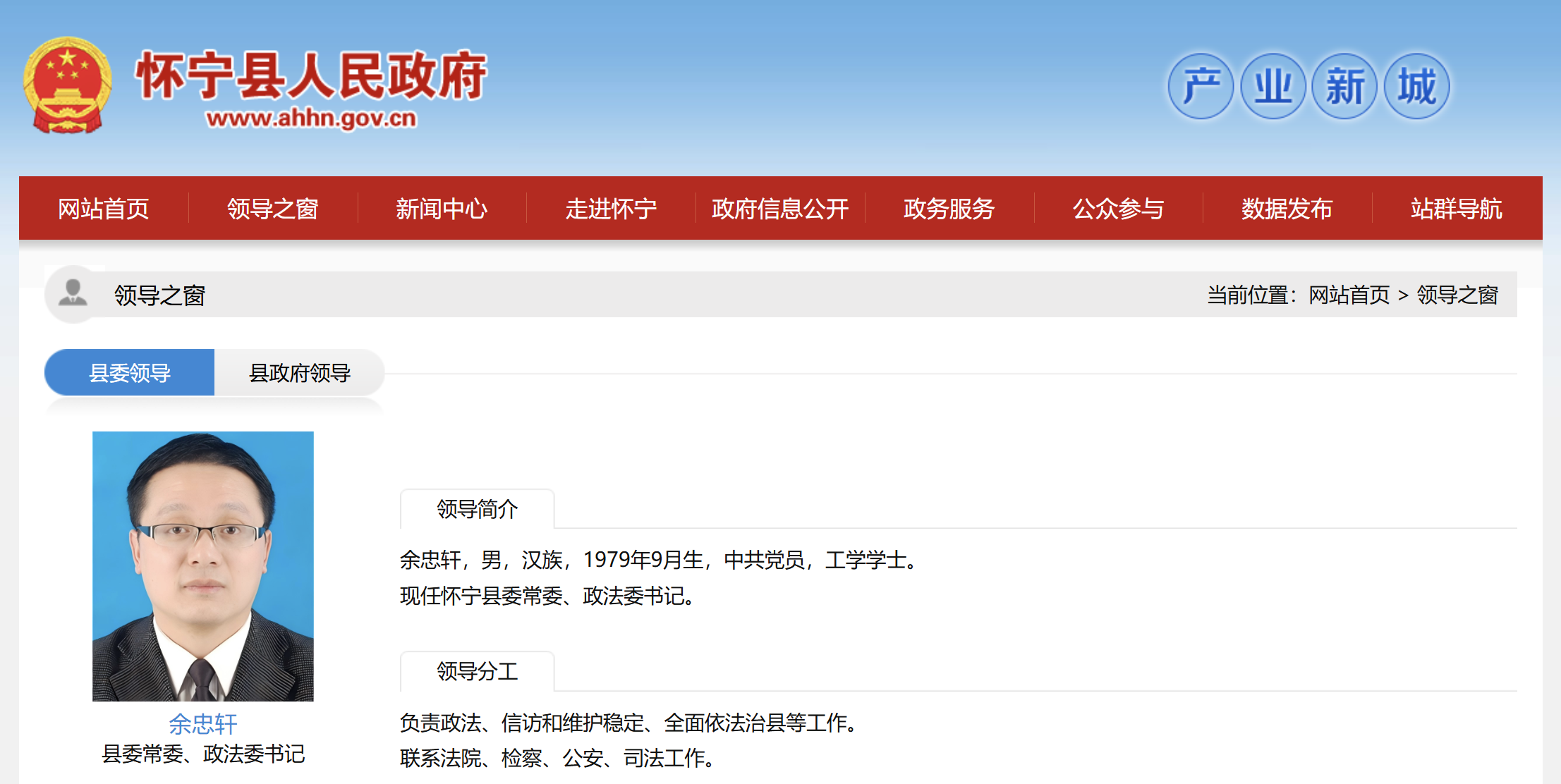 近日,据怀宁县人民政府“领导之窗”一栏更新后显示,余忠轩已任怀宁县委常委、政法委书记。
