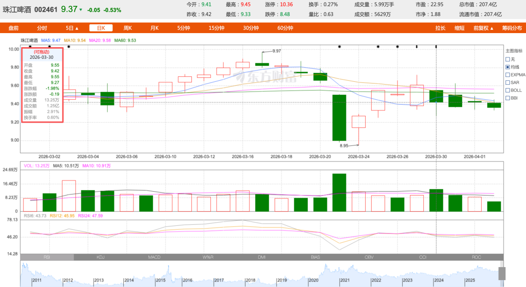 从股价来看,资本市场情绪也相对“冷淡”。这几年,珠江啤酒的股价一直在区间震荡,没有明显的上涨趋势,2025年财报披露后首个交易日,珠江啤酒股价为9.42元/股,同比下跌1.98%。