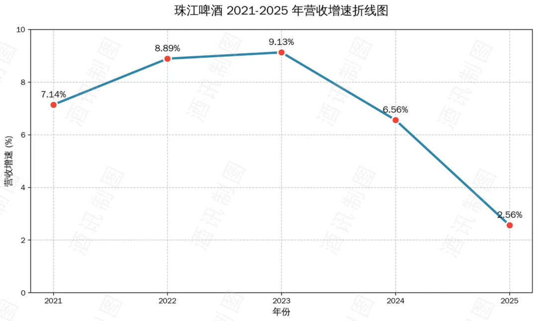 但翻开珠江啤酒近五年的业绩曲线,增速放缓的趋势清晰可见。2021-2023年,珠江啤酒营收增速分别为7.14%、8.89%、9.13%,呈现逐年递增的趋势,但2024年起,营收增速降至6.56%,2025年进一步滑落到2.56%。净利润的波动更明显,2024年还能狂增29.95%,创下历史新高,可2025年已回落至11.54%,增长势头大幅减弱。