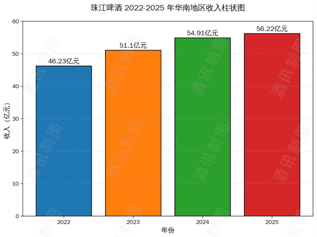 财报数据最能说明问题。2022年-2025年,珠江啤酒来自华南地区的收入分别为46.23亿元、51.1亿元、54.91亿元、56.22亿元,其收入占比分别为93.81%、95.02%、95.81%、95.66%。近三年该公司95%以上的收入都来自华南市场,省外市场的贡献几乎可以忽略不计。