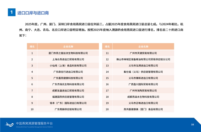 燕之屋始终坚持 100% 正规进口燕窝原料,据中国燕窝溯源管理服务平台数据,其在 2019-2025 年 CAIQ 溯源燕窝国内进口商排行榜中连续 7 年位居榜首,进口量遥遥领先行业其他品牌。